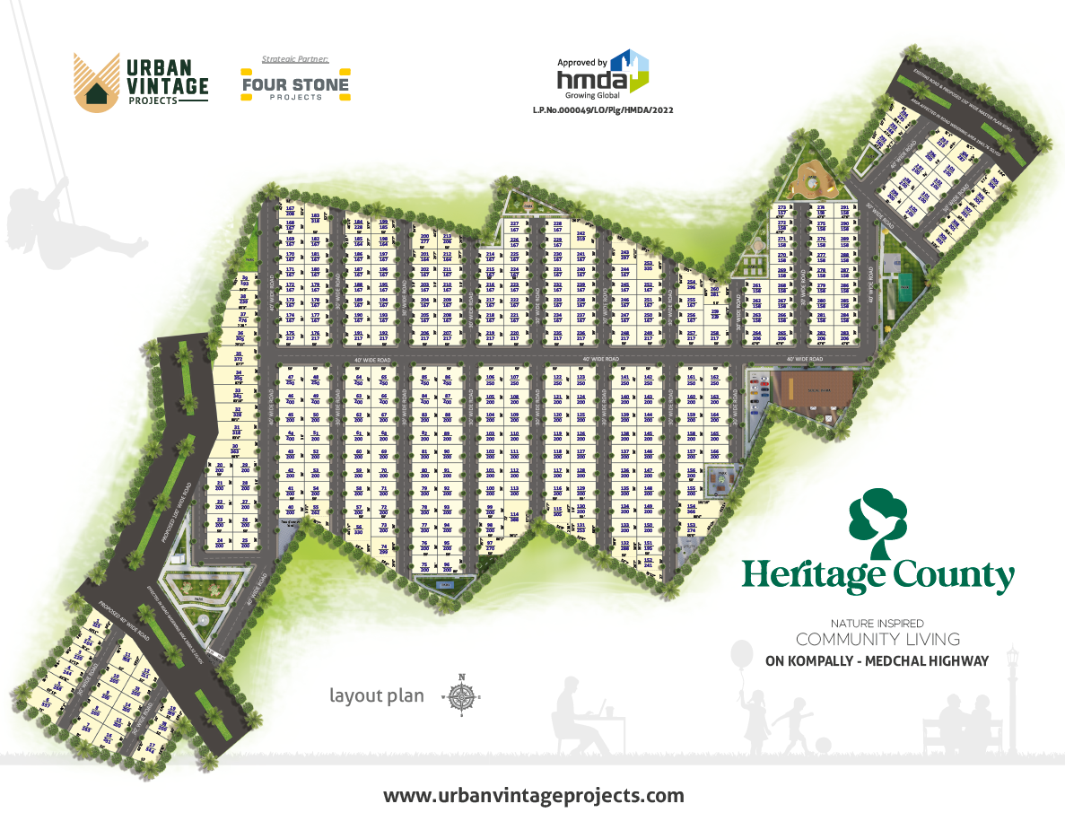 “HERITAGE COUNTY” a 23-acre gated community residential villa plots on Kompally-Medchal Highway (NH-44) close to Outer Ring Road and Newly Announced Kandlakoya gateway IT Park, at Kallakal Village, launched in May 2022, with the goal of creating unique spaces for settling in a positive and peaceful space to everyone's wish. Our settings delight your mind and heart. From the majestic entrance that welcomes you to every inch of your home, there is detailed thinking to offer you the perfect home of your dreams. We created Heritage County to provide you the perfect home.